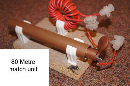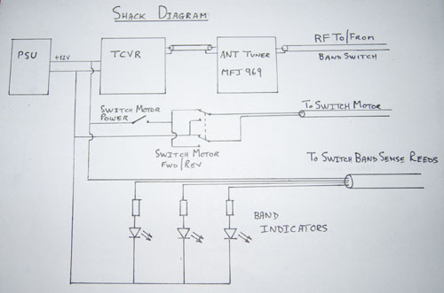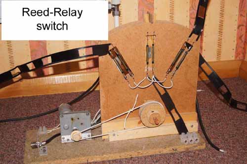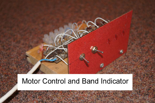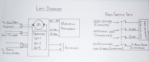 When I moved from my temporary ground-floor shack to a heated cabin in the loft of my garage, I accepted that a long-wire antenna was no longer practical due to the lack of an RF earth. I could have used a counterpoise system, but that would have required a lot of wire to be laid out. As a tower was out of the question, it came down to a trap dipole or a doublet. I went for a doublet, suspended from a pole taking the apex above the roof of the house. Keeping the ends out of reach of all but the most determined, I was still able to deploy about 38 metres of wire each side. The classical doublet has a balanced feed direct from the transmitter to the centre point of the radiator, and has to be kept away from structures, especially metal. The total length (feed plus radiator) can be arranged to match a number of amateur bands. For my application this was impossible, so the idea of a short balanced feed into the house loft to a matching device and then by coax to a mop-up tuner in the shack was tried. Reluctant to spend a lot on a remote auto-tuner for an idea that might not work, I devised the motor-driven switch in the photos. The motor had its own gearbox, and was controlled from the shack. The motor operated a magnet on a pivoted arm to operate a group of four reed switches for each band. The coax feed was commoned across the feed reeds, switched to the matching networks. The other side of the matching networks (A and B legs) were switched to a commoned feed to the antenna. The fourth reed was used to provide an indication in the shack of which matching network had been selected. This wasn’t totally fool-proof – a little adjustment was required to get all four reeds switched together. The spacing used between the reed sets was just about the minimum possible to operate a set of reeds while releasing all of the adjacent set. While setting up the matching networks, it was found that although the doublet was physically symmetrical, electrically it was anything but. Using a home-brew contraption of variable inductors and capacitors, and measuring with an MFJ Analyser, all sorts of combinations were used to get a reasonable match to 50 Ohms on the 80, 40 and 20 metre bands: 80 metres : Capacitance 145pF in ‘A’ leg, inductance 9.1 microhenry in ‘B’ leg 40 metres : Inductance of 15 microhenry in ‘A’ leg, through connection in ‘B’ leg 20 metres : Through connection in ‘A’ leg, Inductance of 0.8 microhenry in ‘B’ leg, with 37pF between ‘A’ and ‘B legs on the coax side of the network, and 135pF between the ‘A’ and ‘B’ legs on the antenna side. NB: The coax centre became the ‘A’ leg, and the screen became the ‘B’ leg. The coax was sleeved with a number of ferrite rings to ensure unbalanced operation and prevent radiation from the screen.
